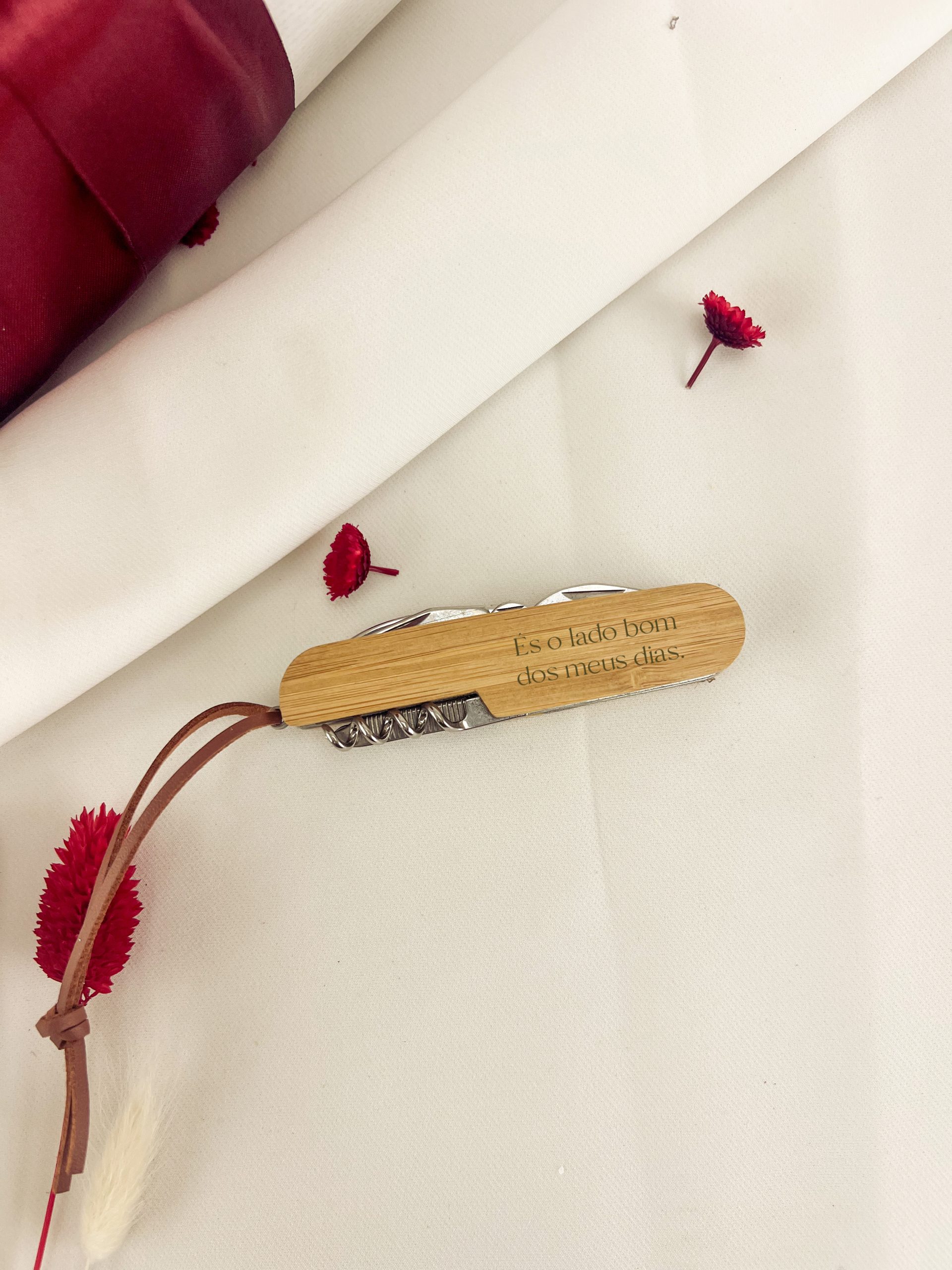 Canivete multifunções em aço inoxidável com superfície de bambu.
