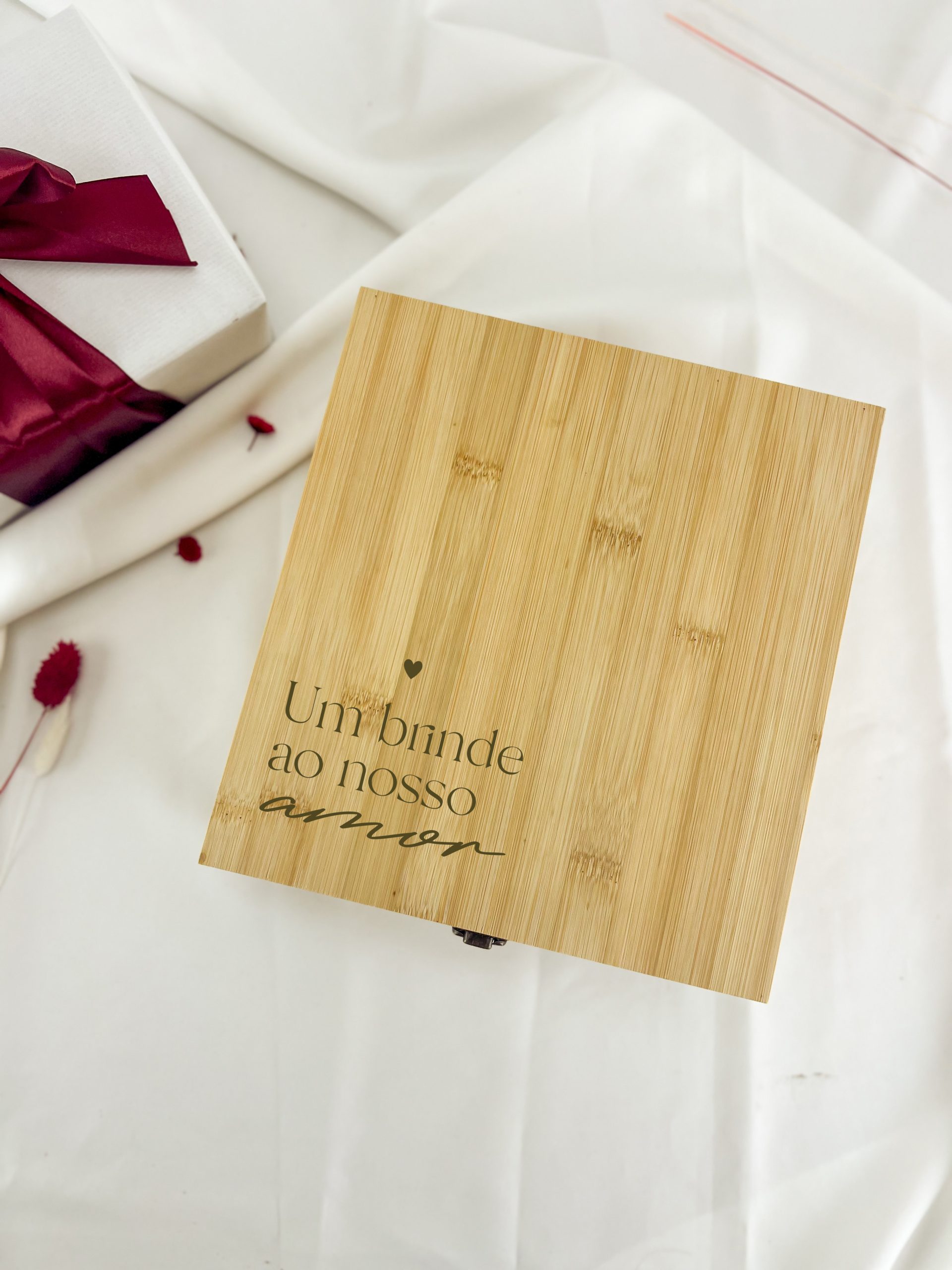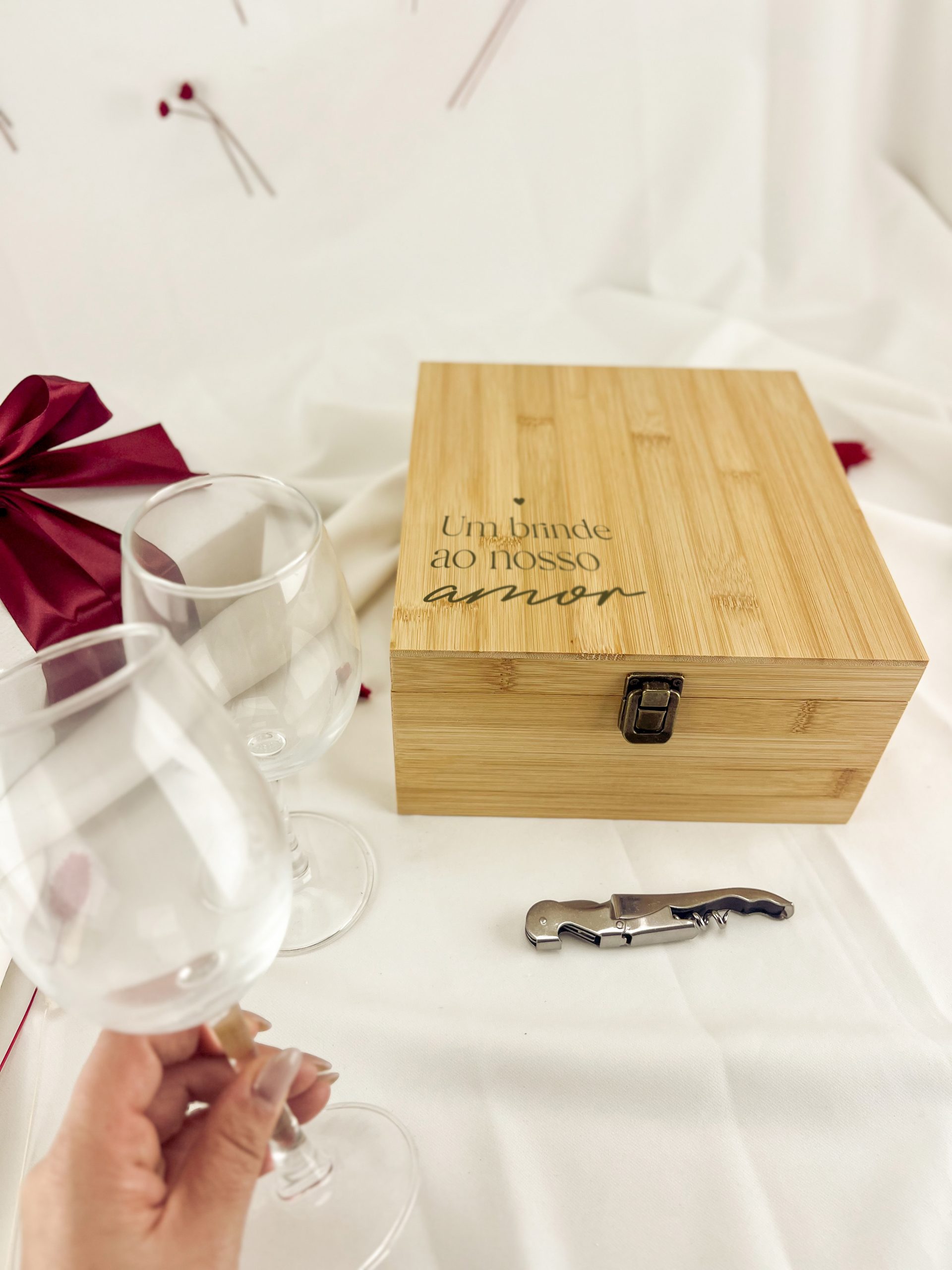 Caixa personalizada com 2 copos para vinho. Inclui 2 copos de cristal 350ml e saca-rolhas de 2 tempos em inox, com corta cápsulas.