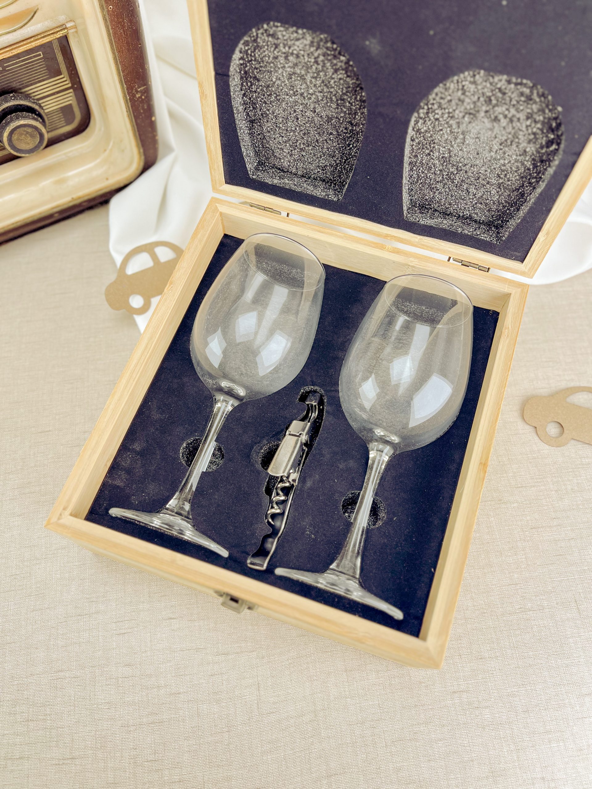 Caixa personalizada com 2 copos para vinho. Inclui 2 copos de cristal 350ml e saca-rolhas de 2 tempos em inox, com corta cápsulas.