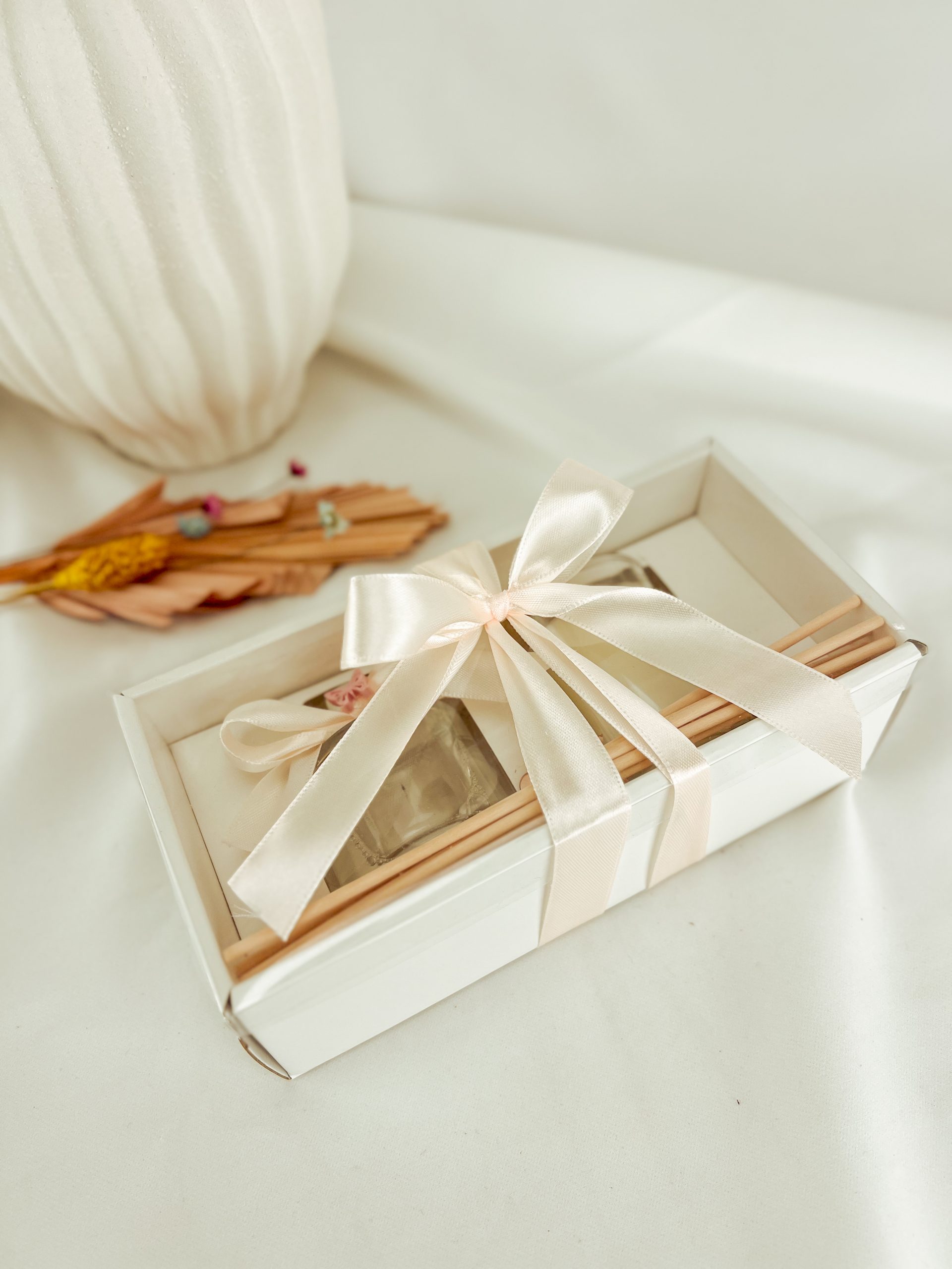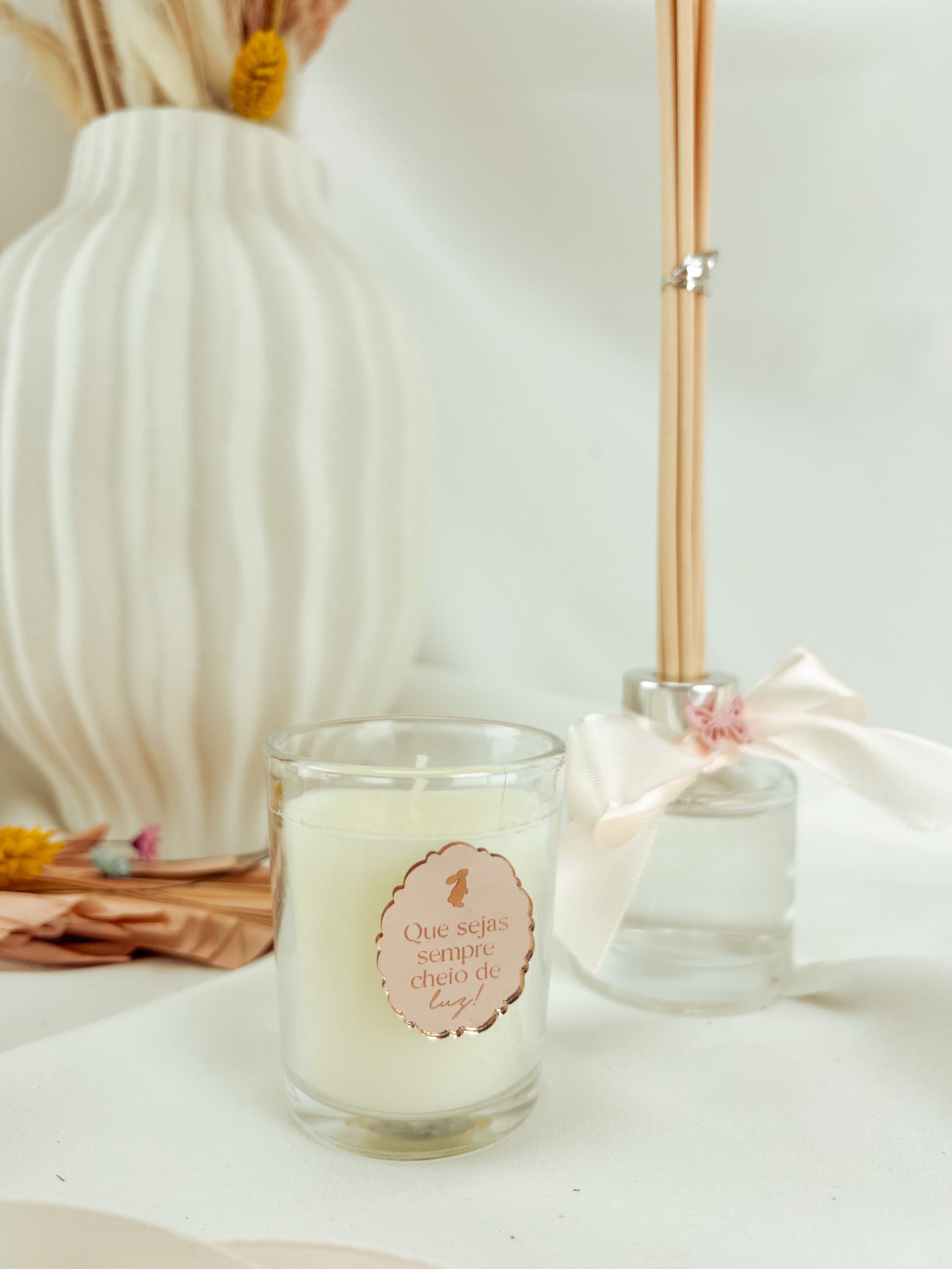 Dimensão: 18x8,5x5,5cm Difusor aromático com aroma jasmim em frasco de vidro de 50 ml, com 10 varetas de vime e tampa em alumínio. Vela aromática com aroma baunilha em frasco de vidro. Inclui caixa