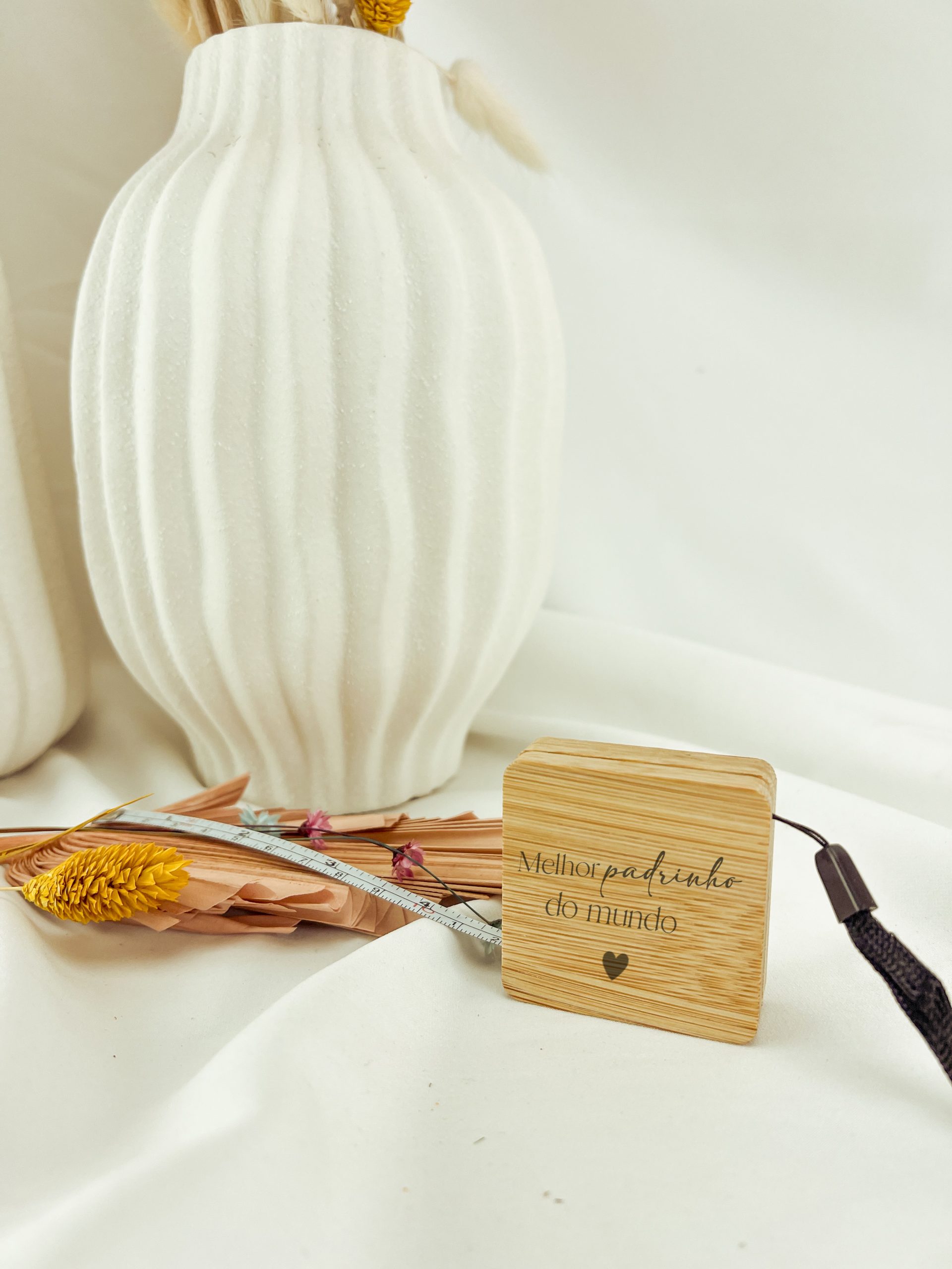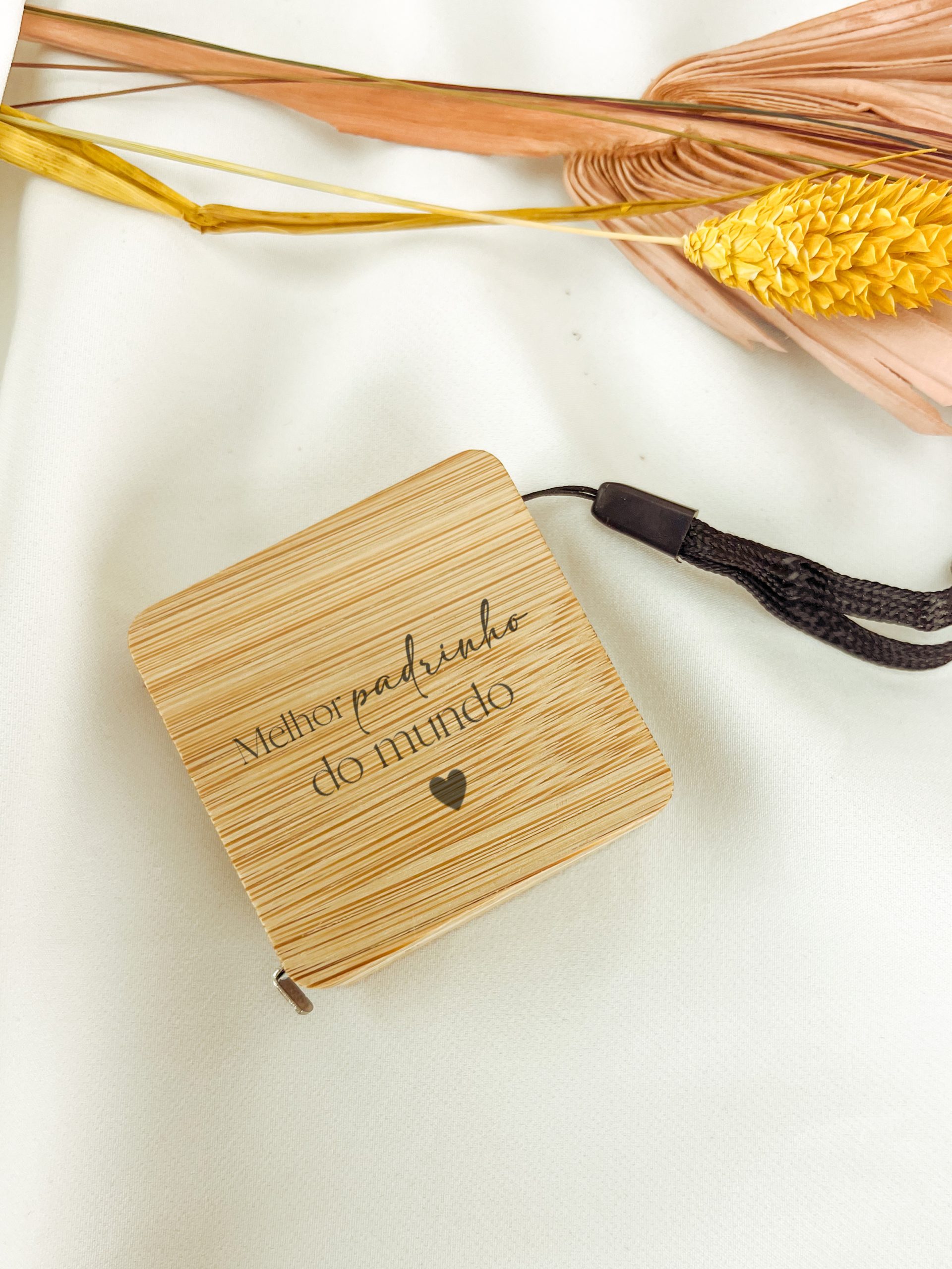 Fita métrica de 1 m fabricada em bambu, com fita de metal em centímetros e polegadas.