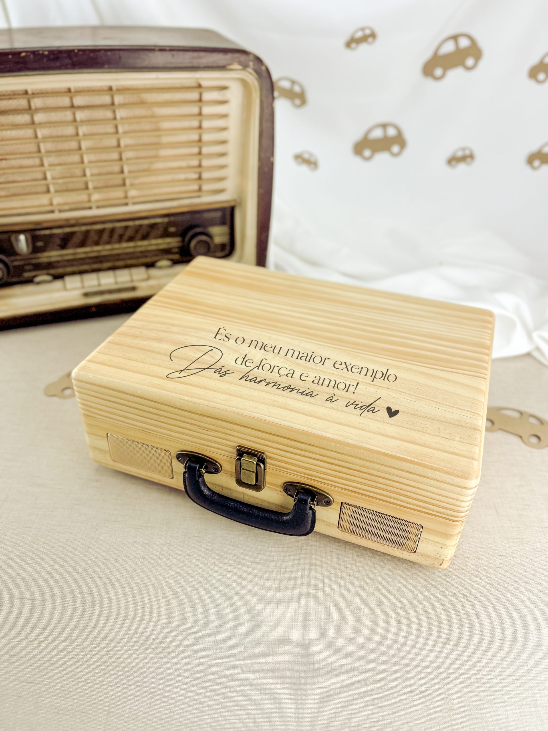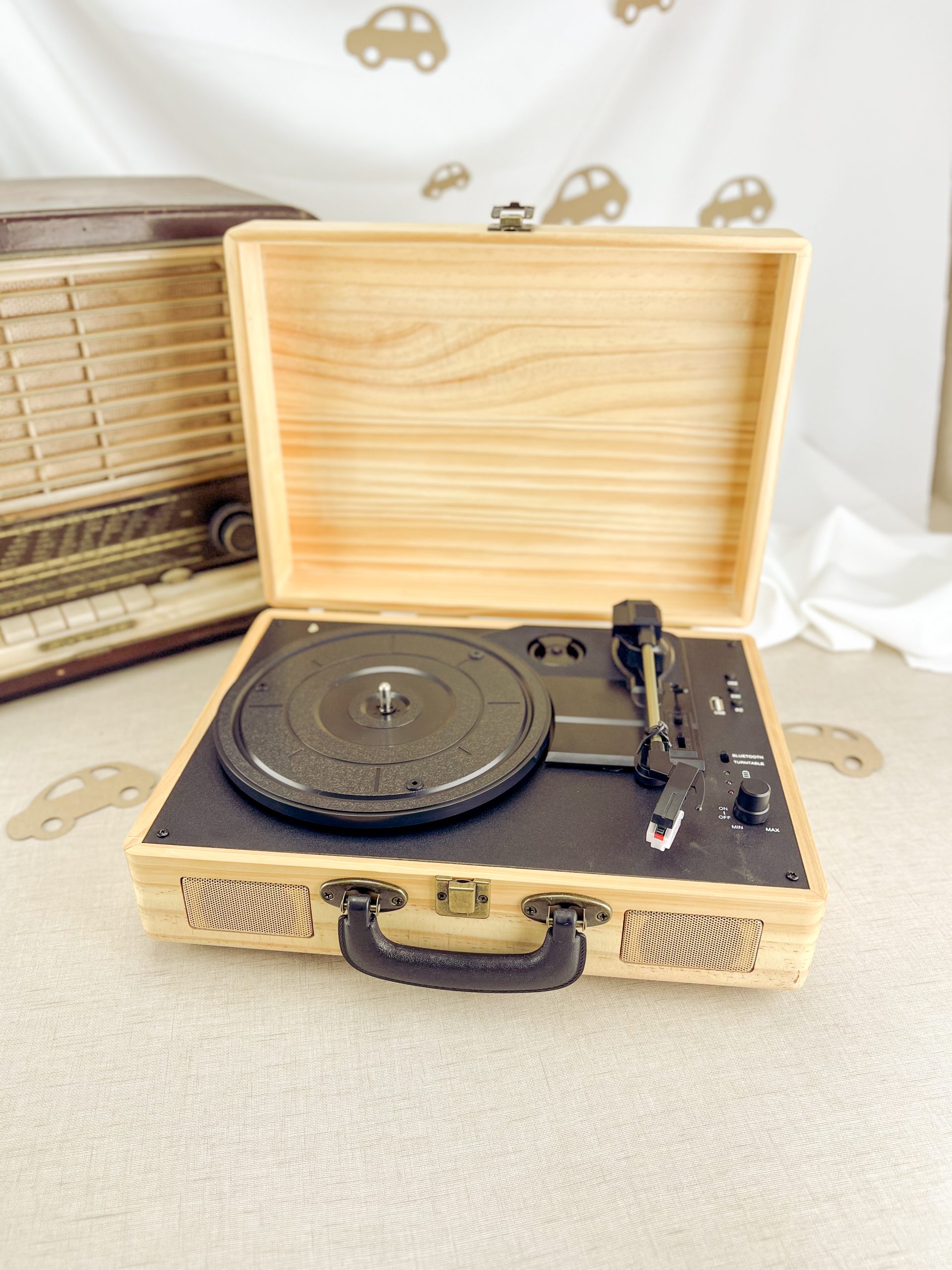 Gira-discos portátil apresentado numa caixa de madeira natural, com fecho de segurança e pega de transporte. Compatível com discos de 33, 45 e 78 RPM e com adaptador central para singles de 7″. Braço reto, com função de recolha automática quando chega ao fim de cada lado do disco e tampa protetora para a agulha quando não está a ser utilizada. Conexão Bluetooth e altifalantes estéreo integrados de 3 W de potência, com função reprodutora para ligar uma USB. Além disso, oferece a possibilidade de digitalizar discos de vinil de uma forma simples.