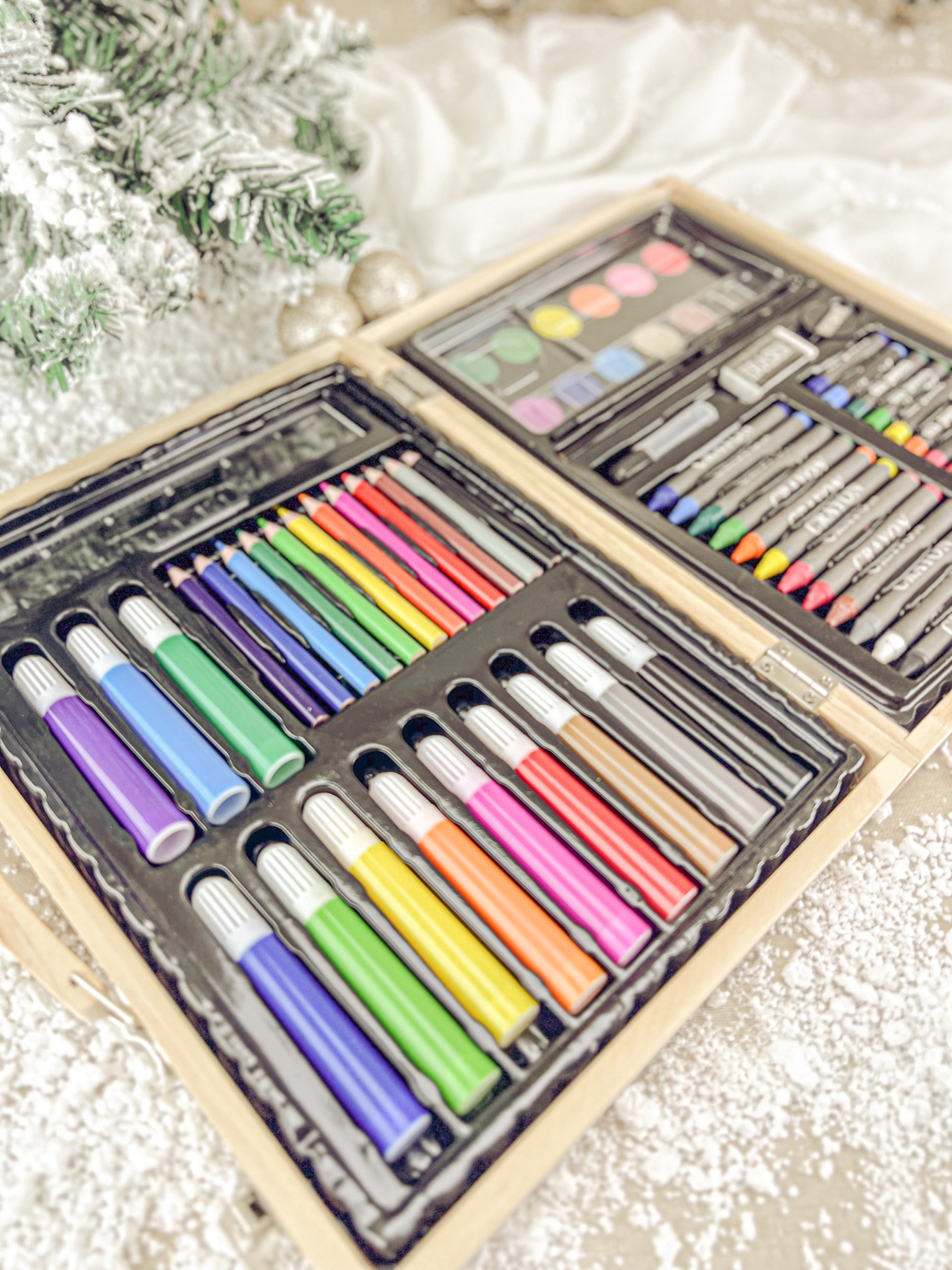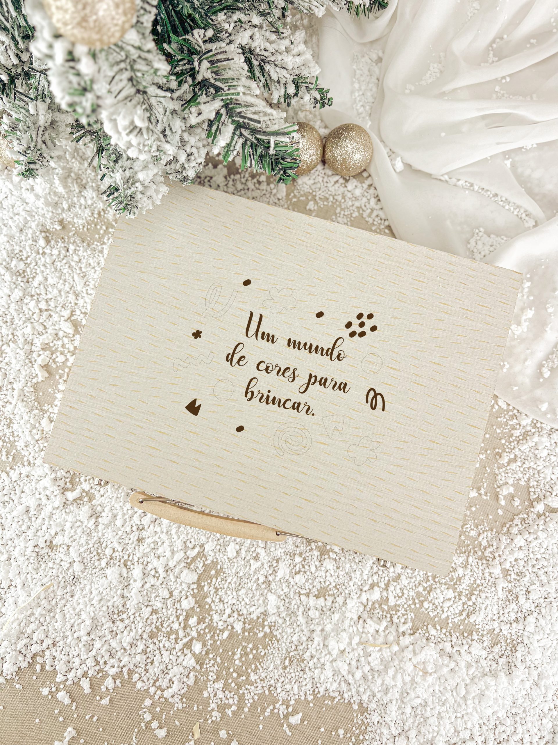 Maleta em madeira com kit completo para colorir.