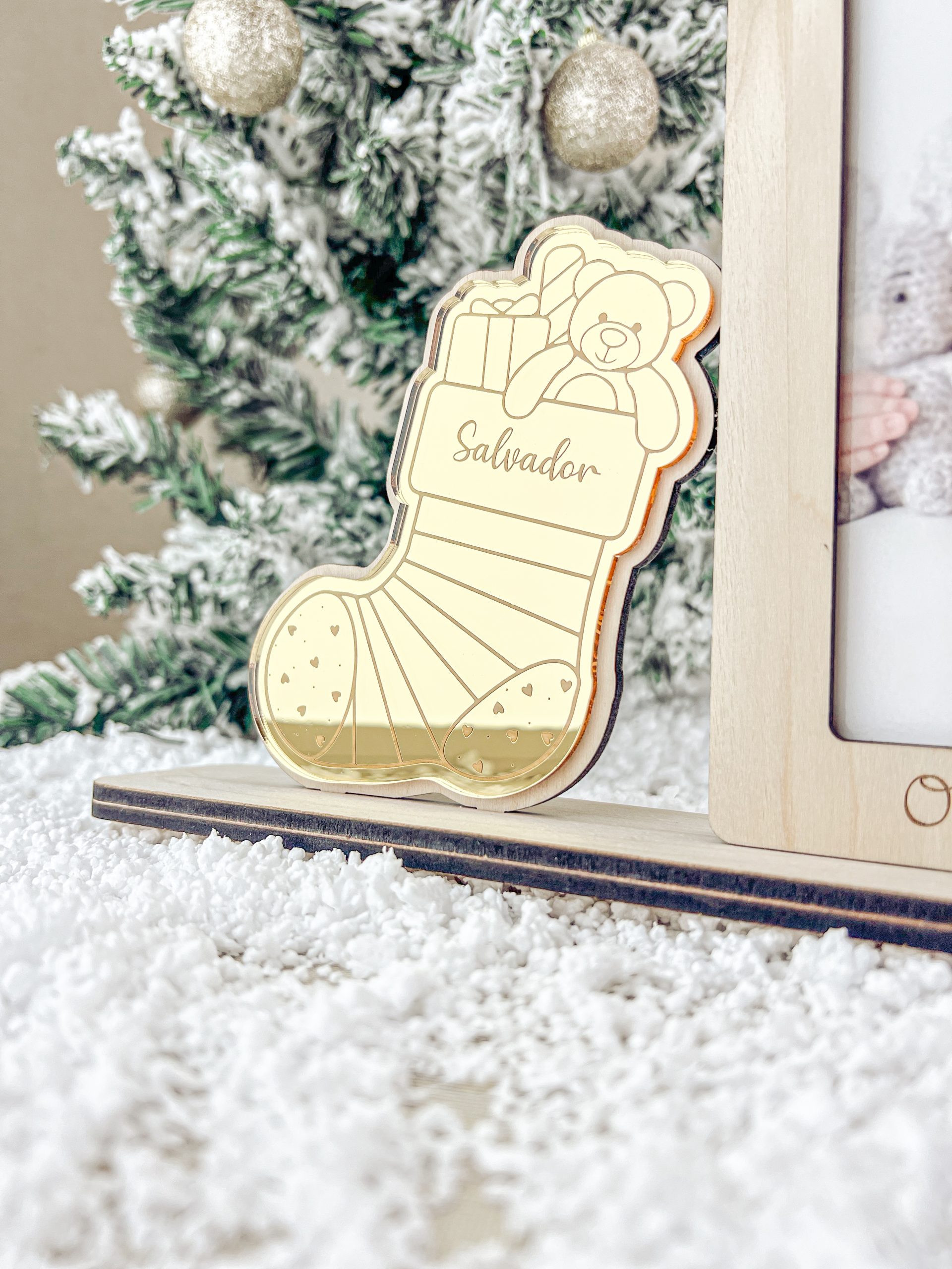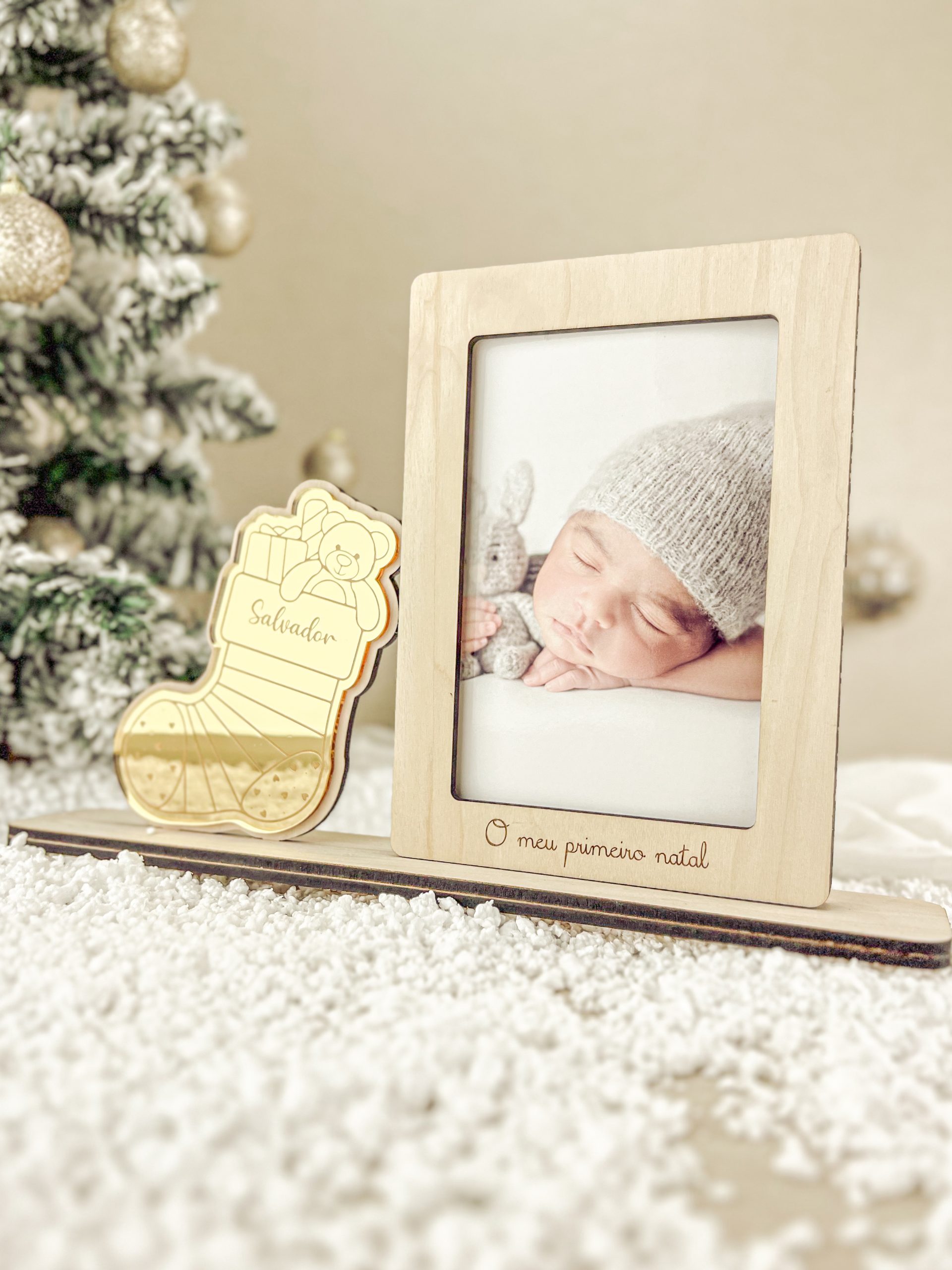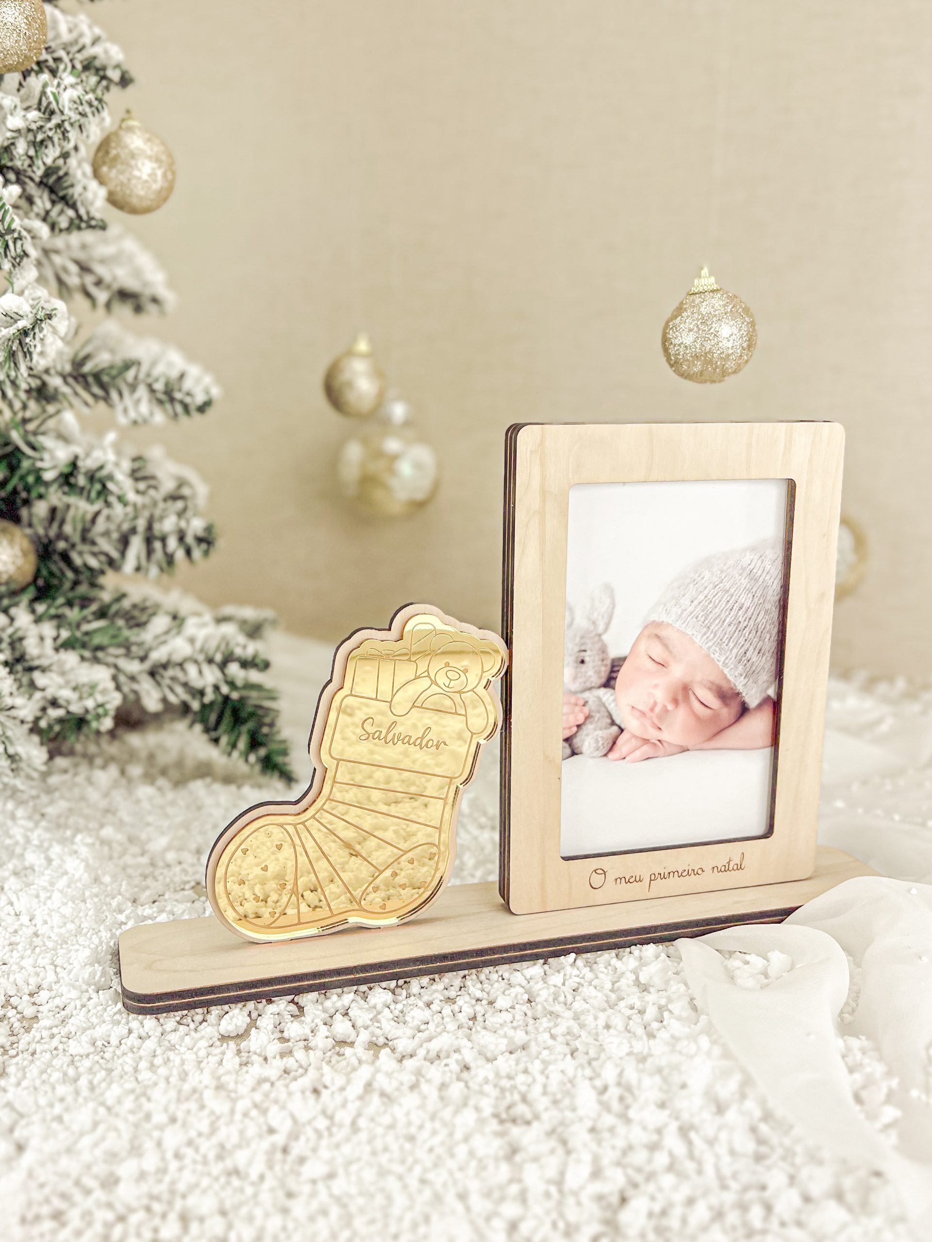 Material : Bétula e Acrílico Dourado Dimensão : 30 x 20CM Tamanho Fotografia : 10 x 15CM Bota em acrílico dourado