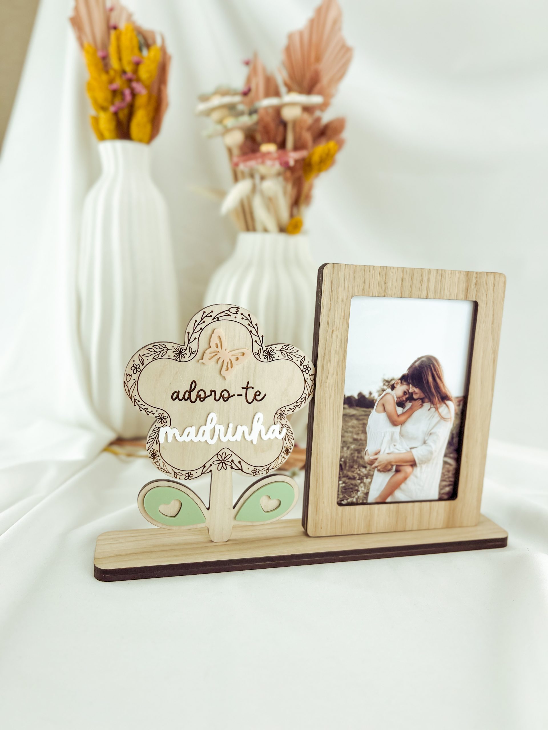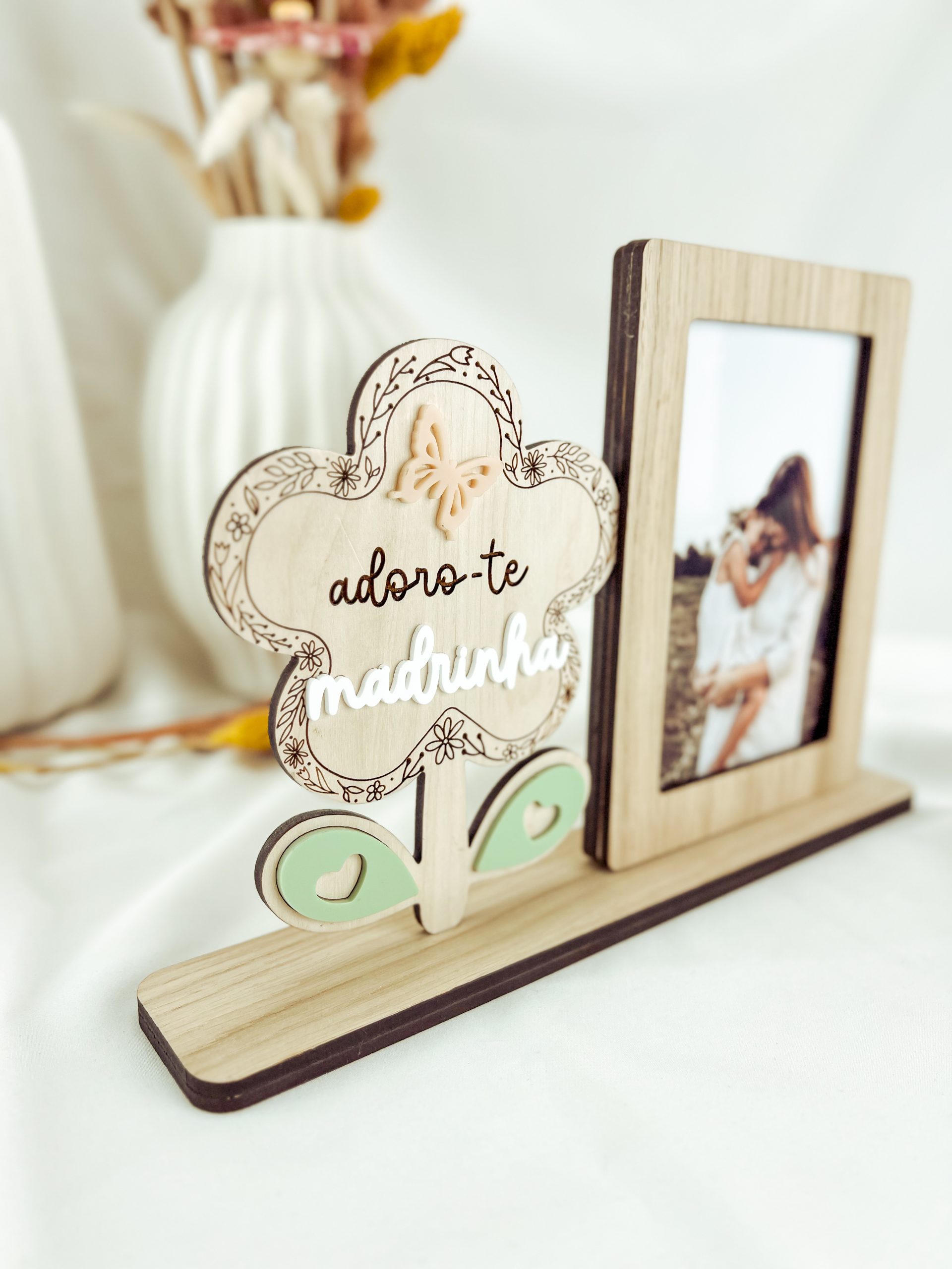 Borboleta em acrílico coral, folha em acrílico verde seco e palavra Madrinha em acrílico branco