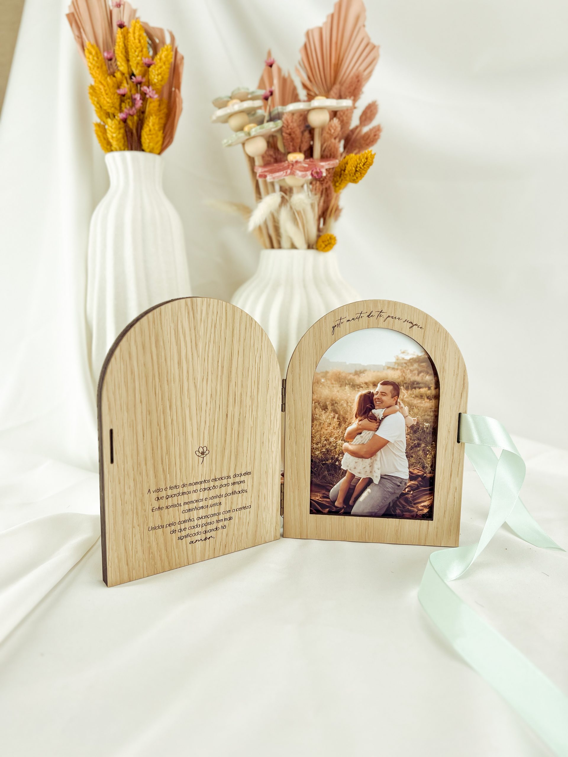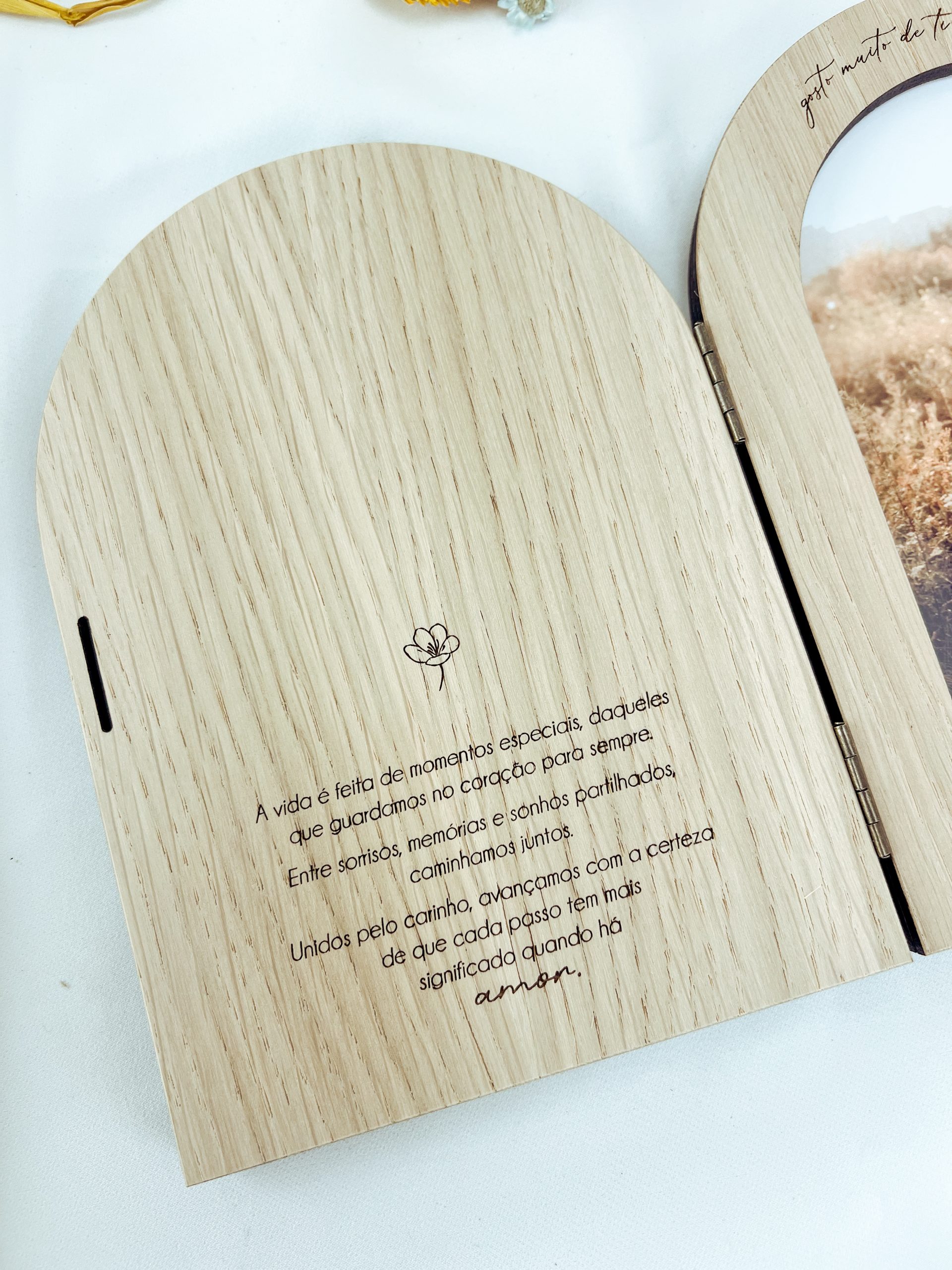 Moldura em formato livro com topo redondo. Possibilidade de personalizar com outros textos. Se pretender com fotografia, envie por favor a mesma por e-mail para encomendas@lightcut.pt com o respetivo número de encomenda gerado no carrinho.