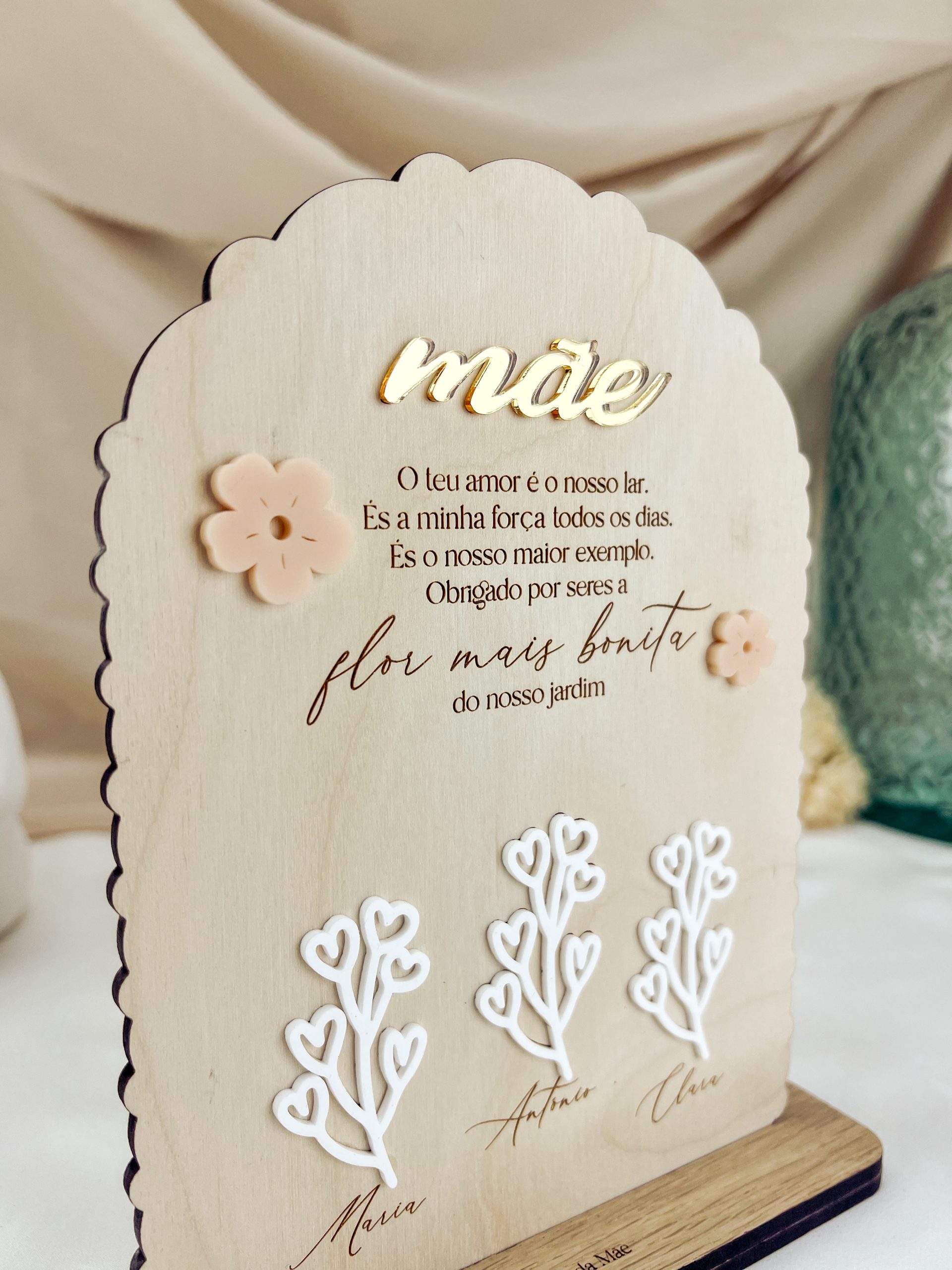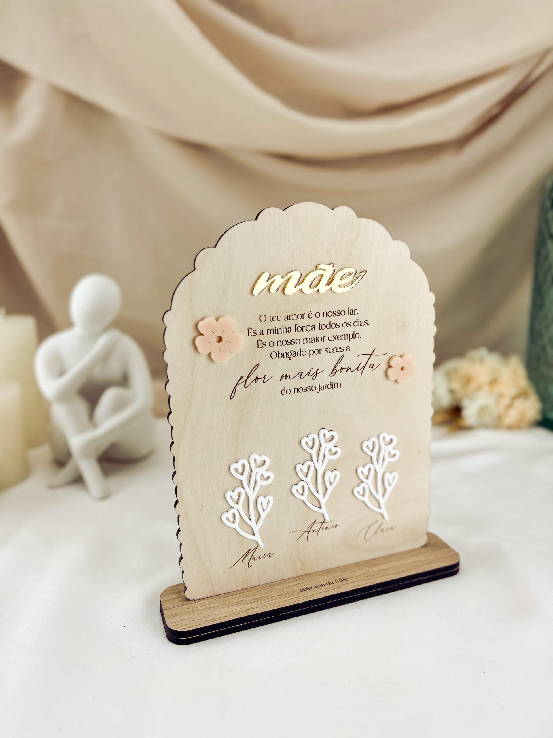 Material : Bétula e Carvalho Dimensão : 17CM x 20CM Palavra MÃE em acrílico dourado Flores em acrílico coral Ramos em acrílico branco
