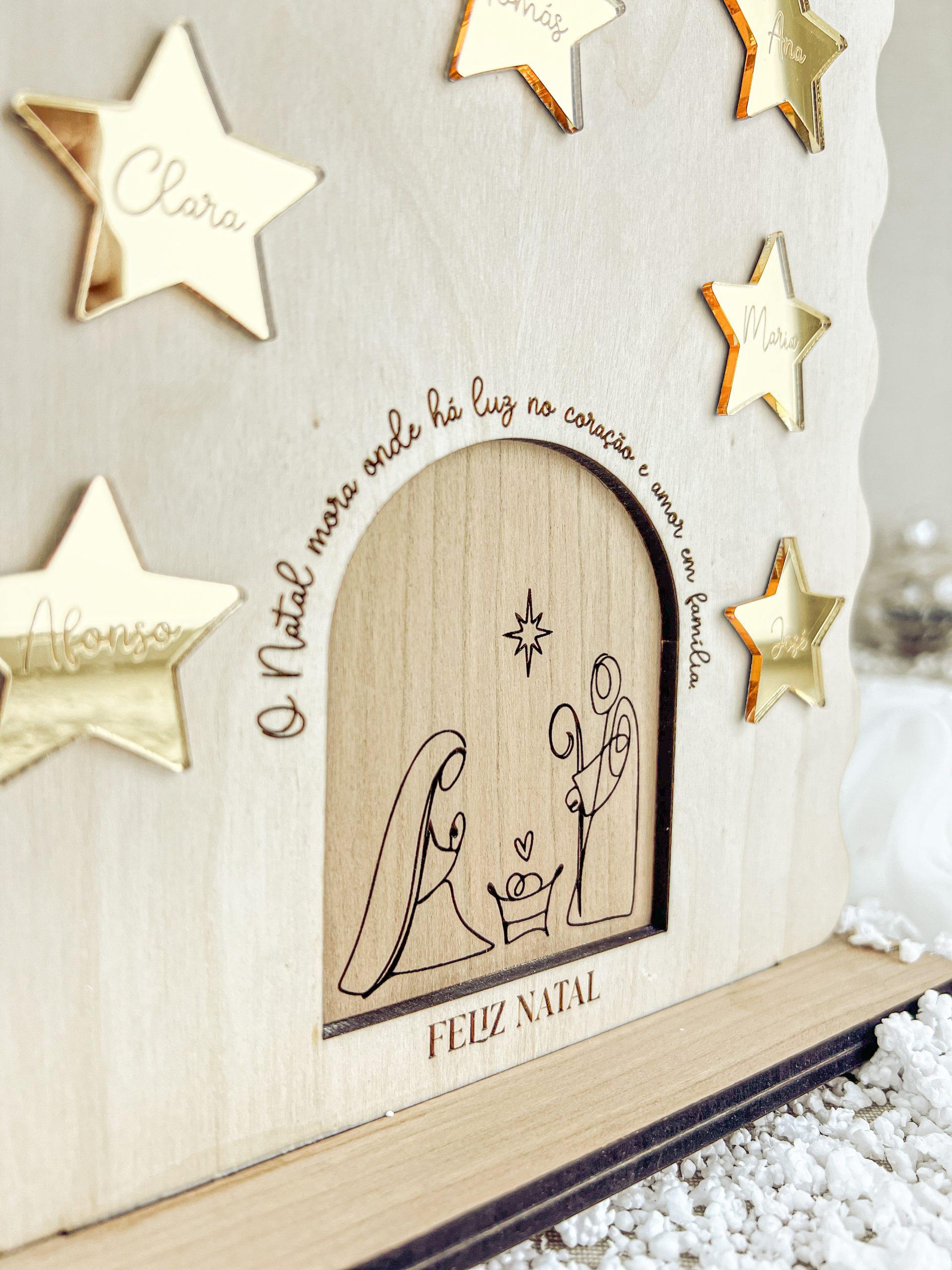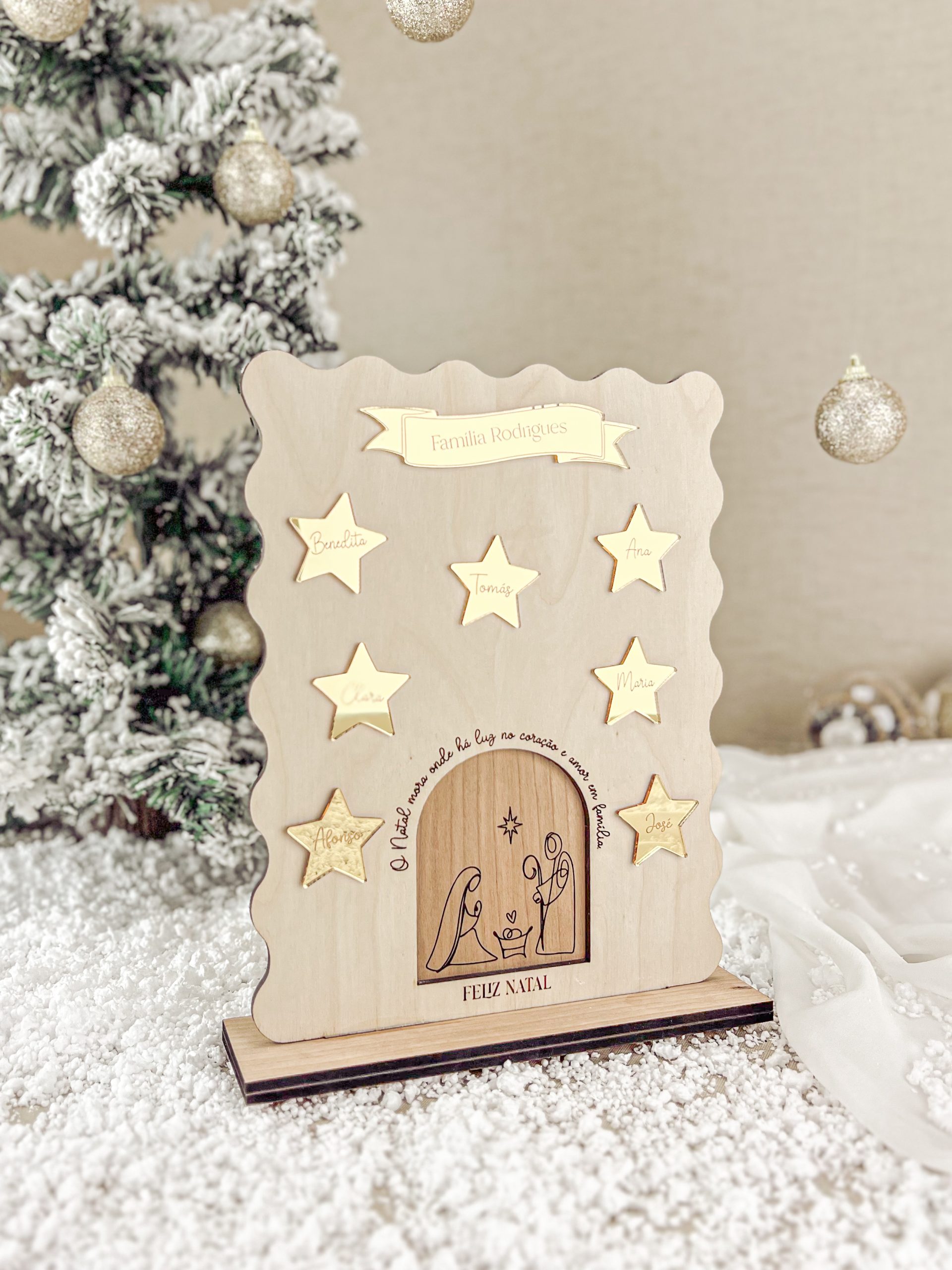 Materiais: Bétula e Cerejeira Dimensão: 18cm x 23cm Placa nome da família e estrelas em acrílico dourado Presépio em cerejeira Inclui até 8 estrelas