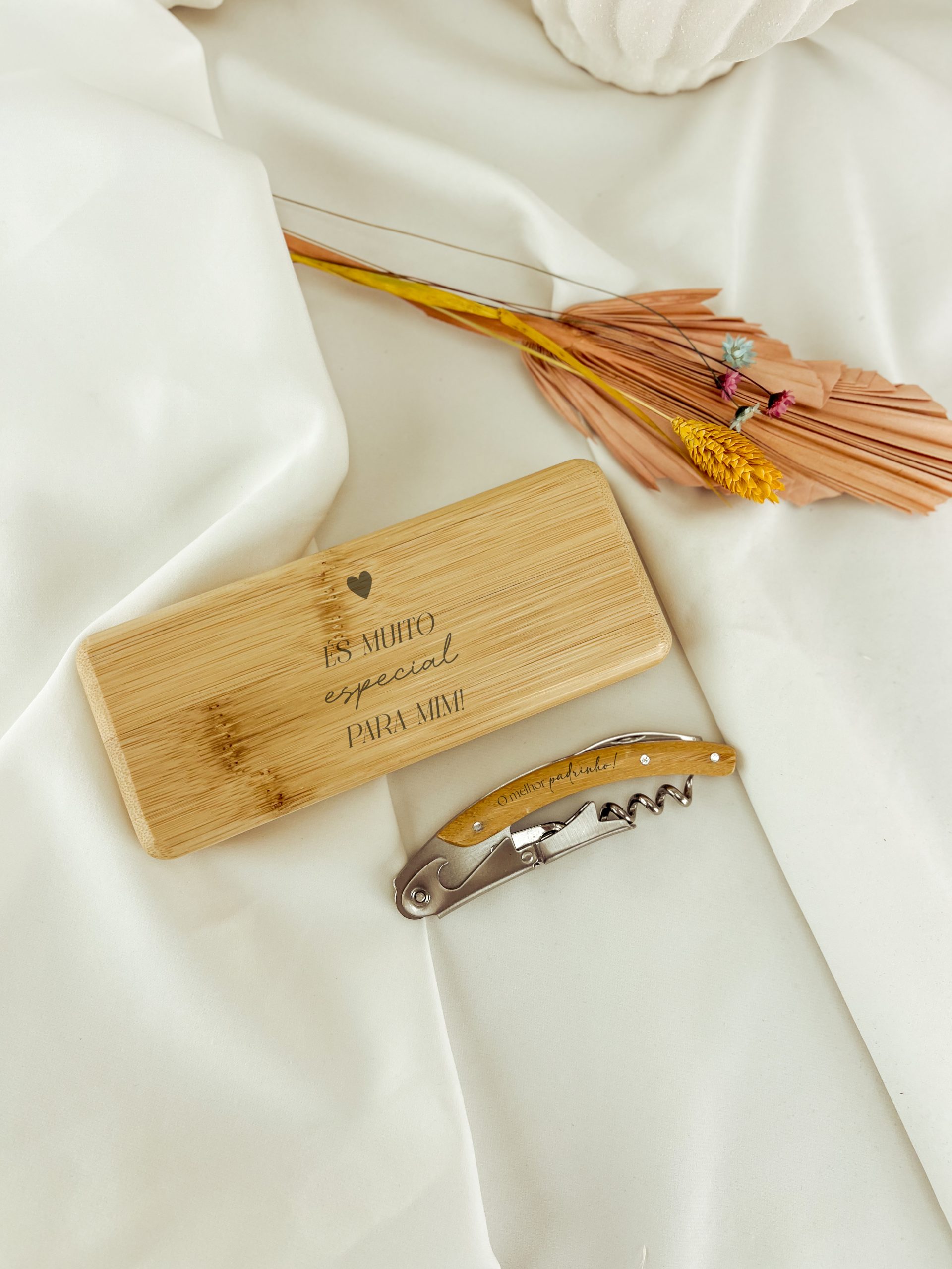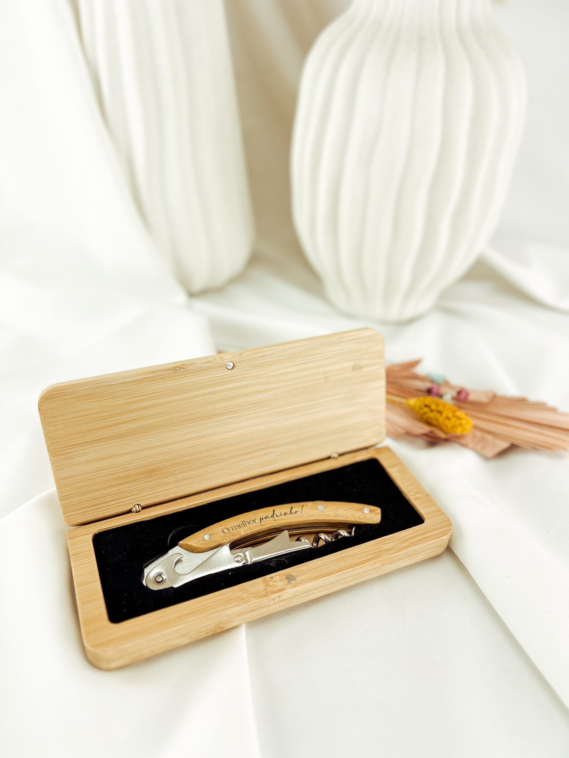 Com abridor de garrafas e cortador de cápsulas.
