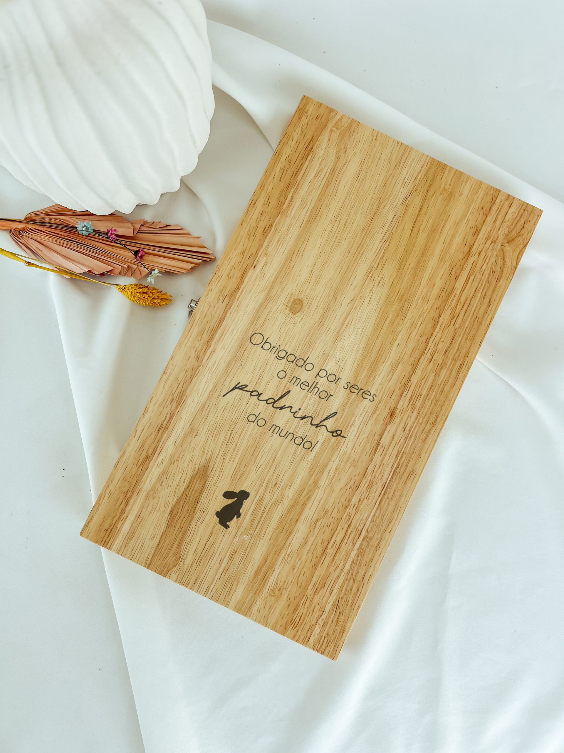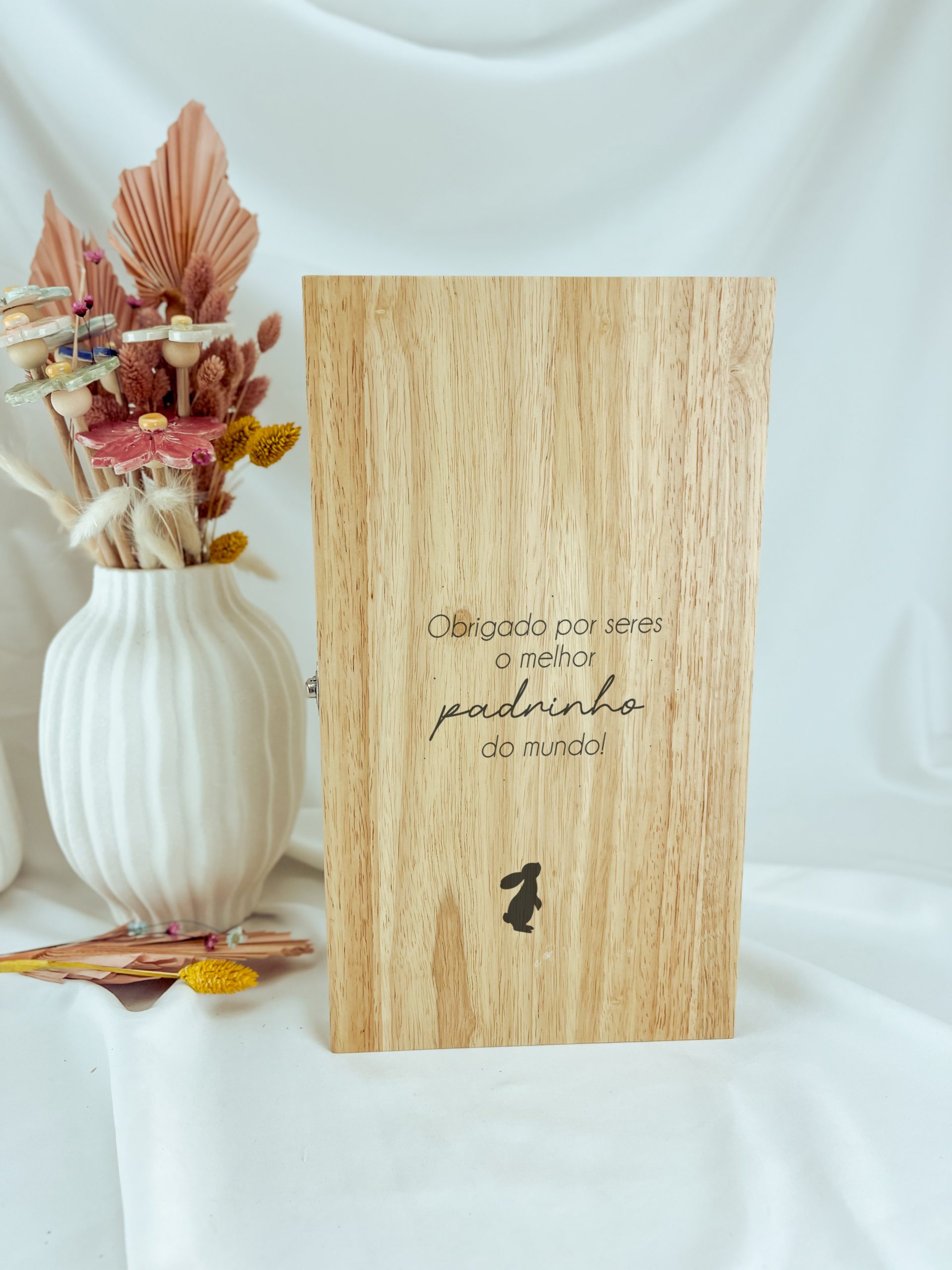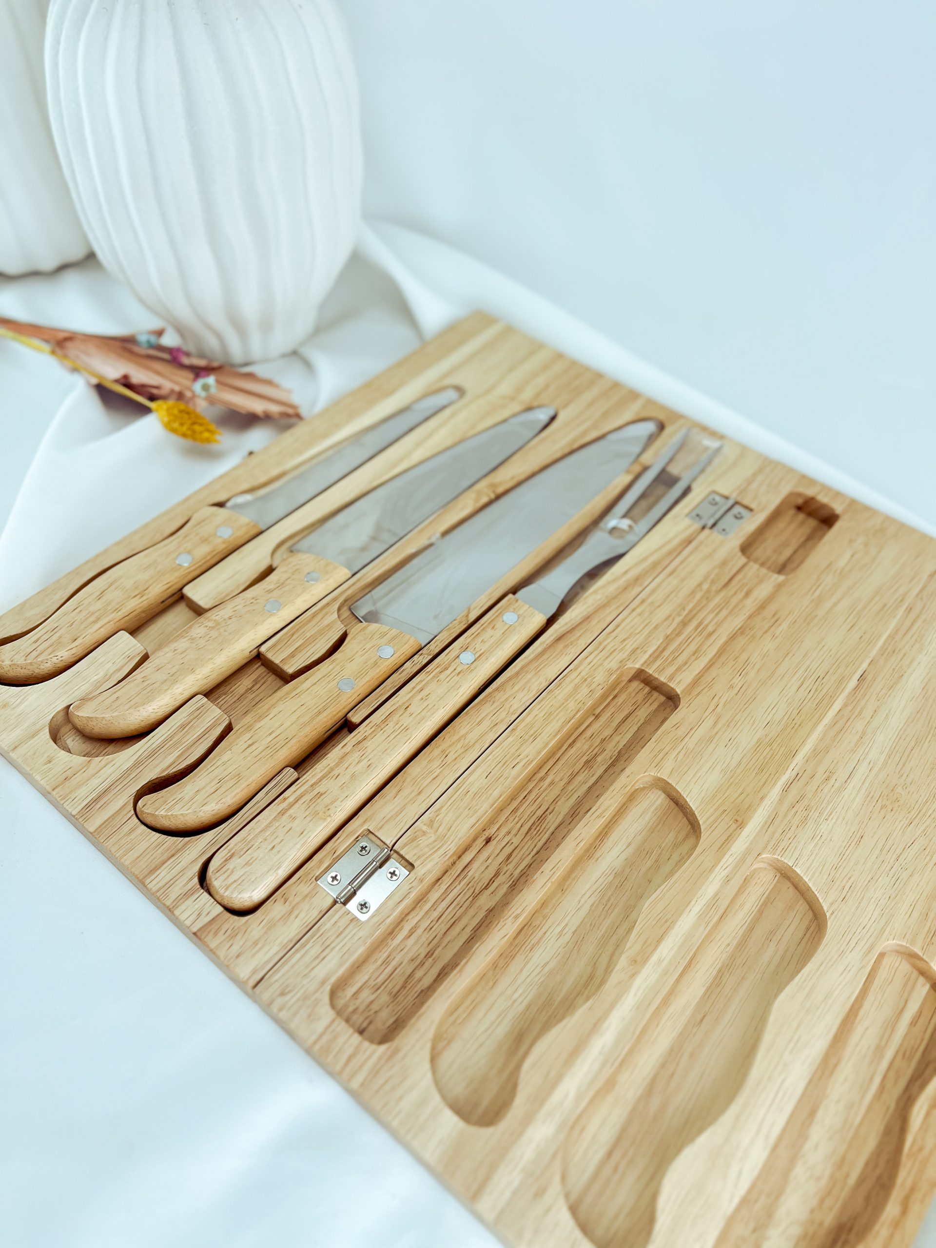 Set de facas feitas em madeira natural e aço inoxidável, em estojo de madeira recortado com fecho metálico.